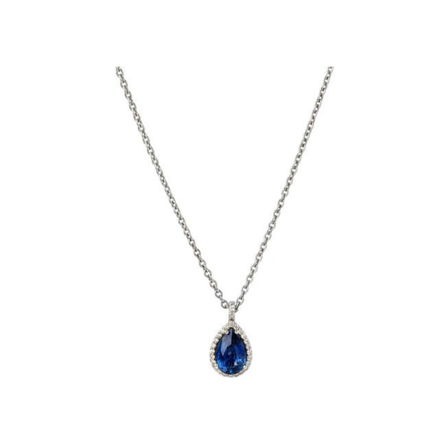 Pendentif en or gris avec saphir bleu poire de 1,27 ct, entouré de diamants 0,14 ct, sur chaîne en or gris