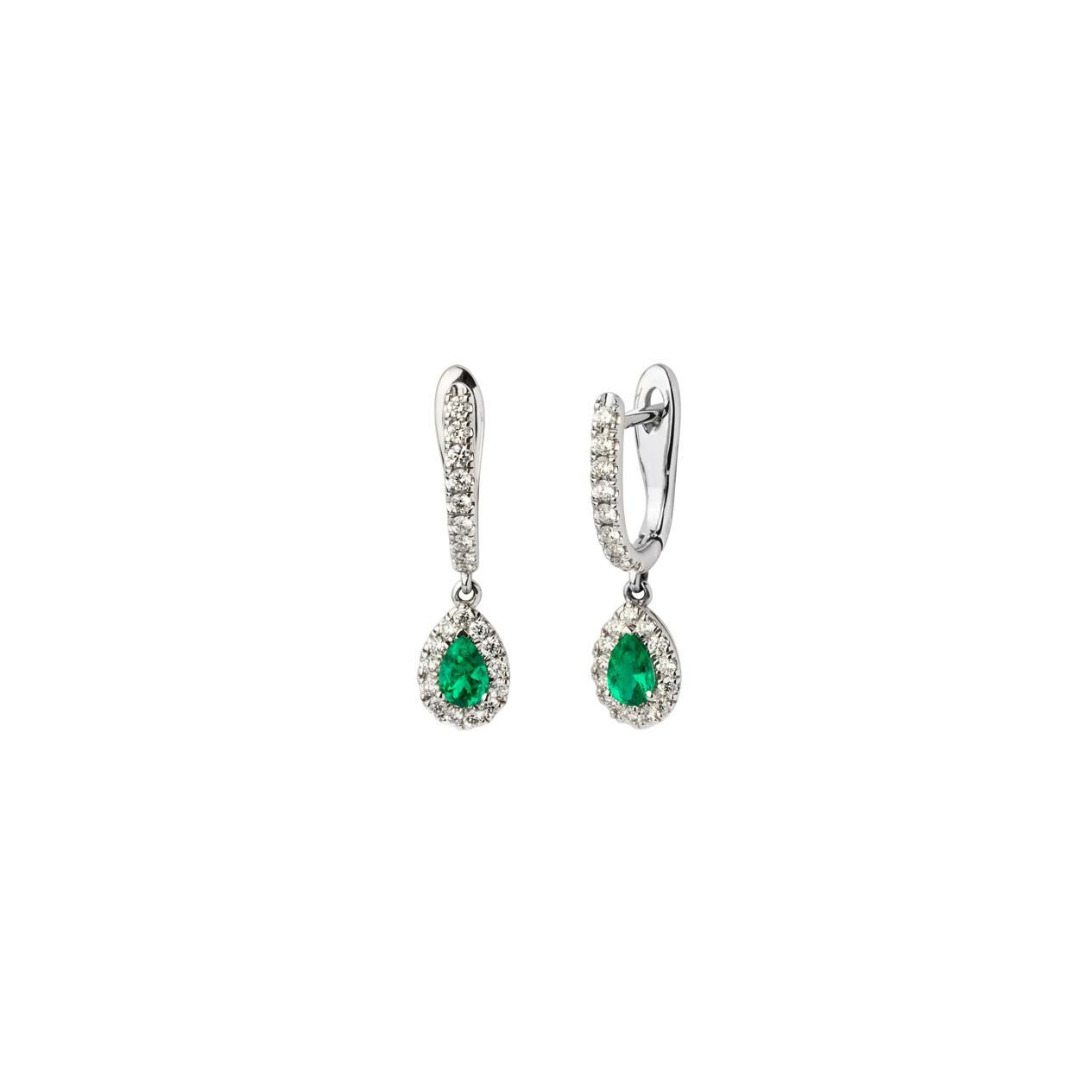 Boucles d’oreilles dormeuses en or gris avec émeraudes poire (0,39 ct) entourées de diamants (0,47 ct)
