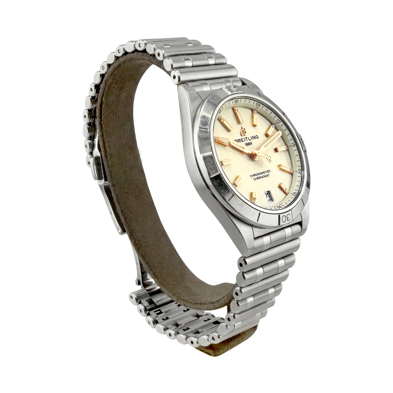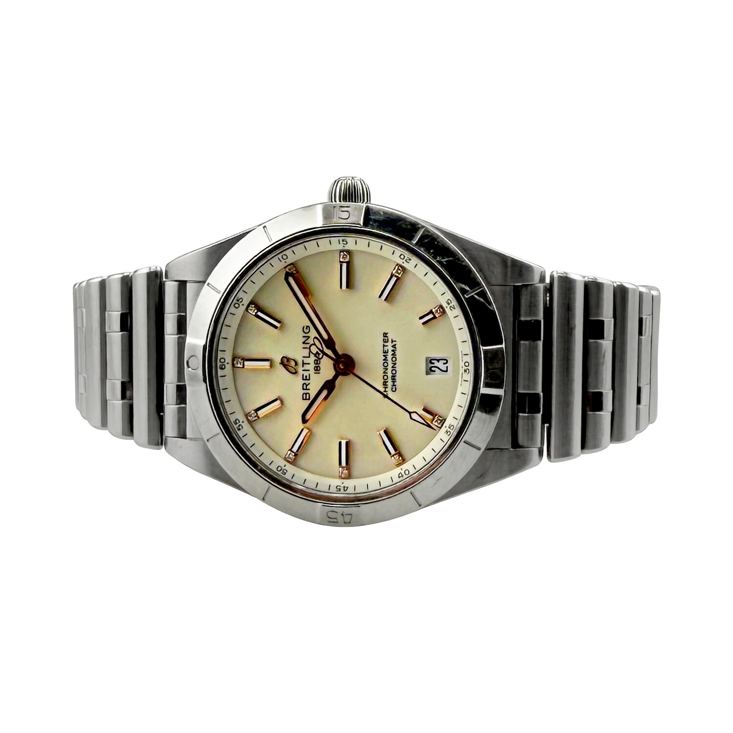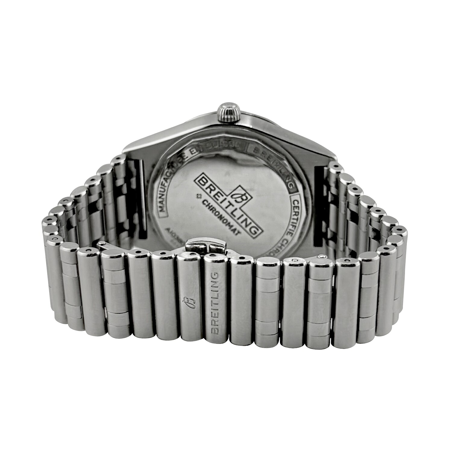 Cadran blanc et index sertis diamants. Affiche la date. Etanche 100 m. Bracelet rouleau Breitling en acier fermé par une boucle déployante.