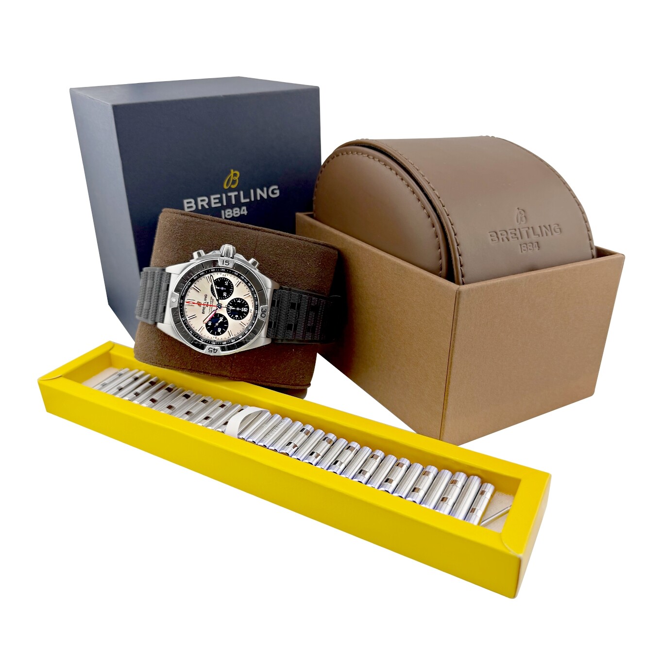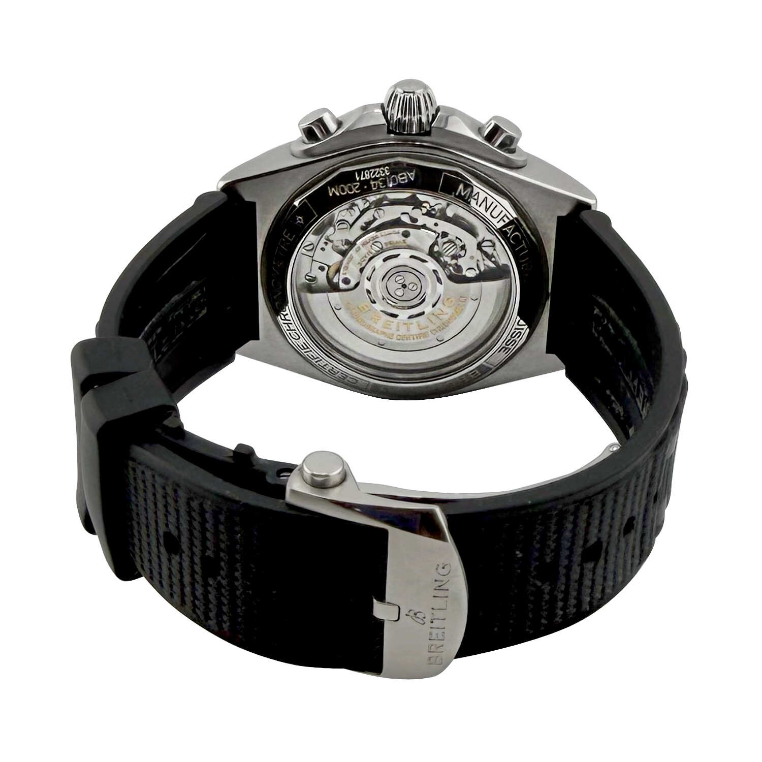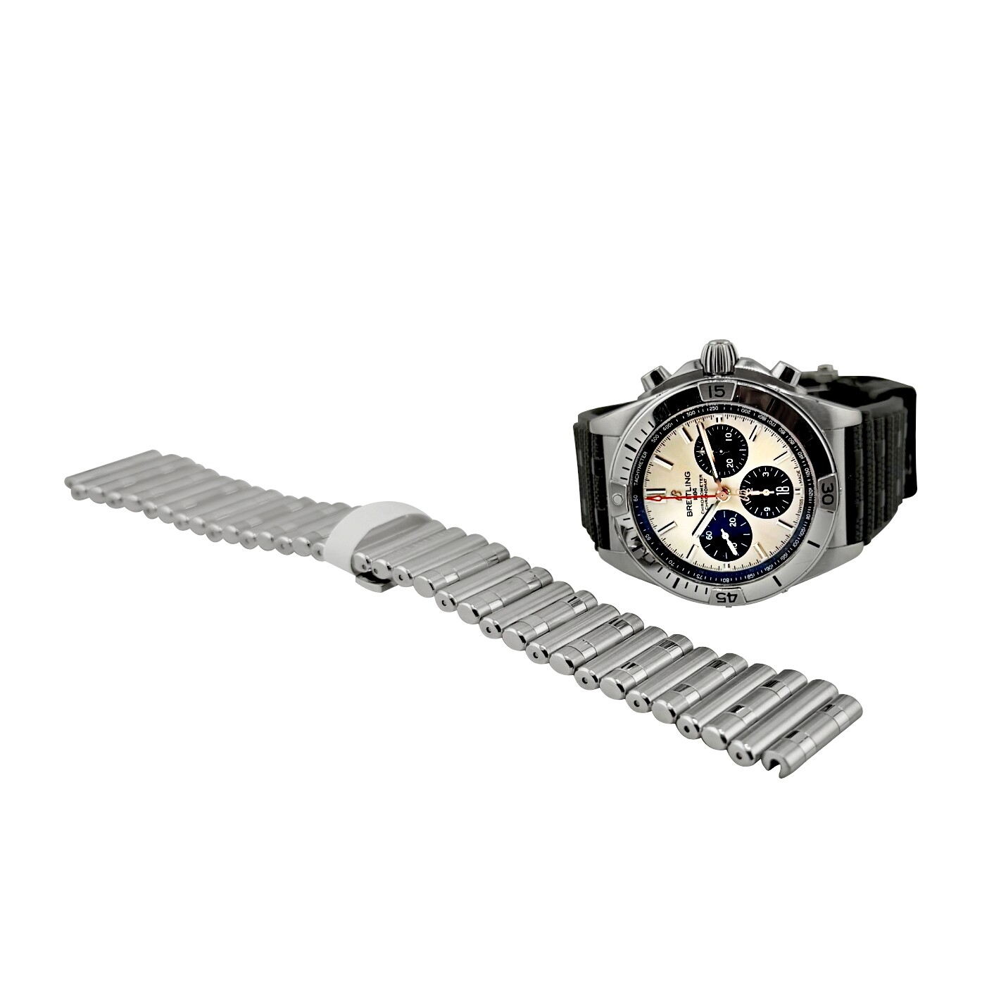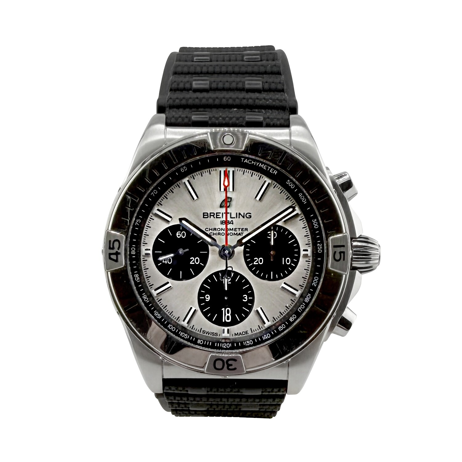 Breitling Chronomat B01 42mm, AB0134, boitier acier, cadran gris compteurs noirs. Mouvement manufacture automatique. Bracelet rouleaux en caoutchouc noir boucle déployante + bracelet acier.