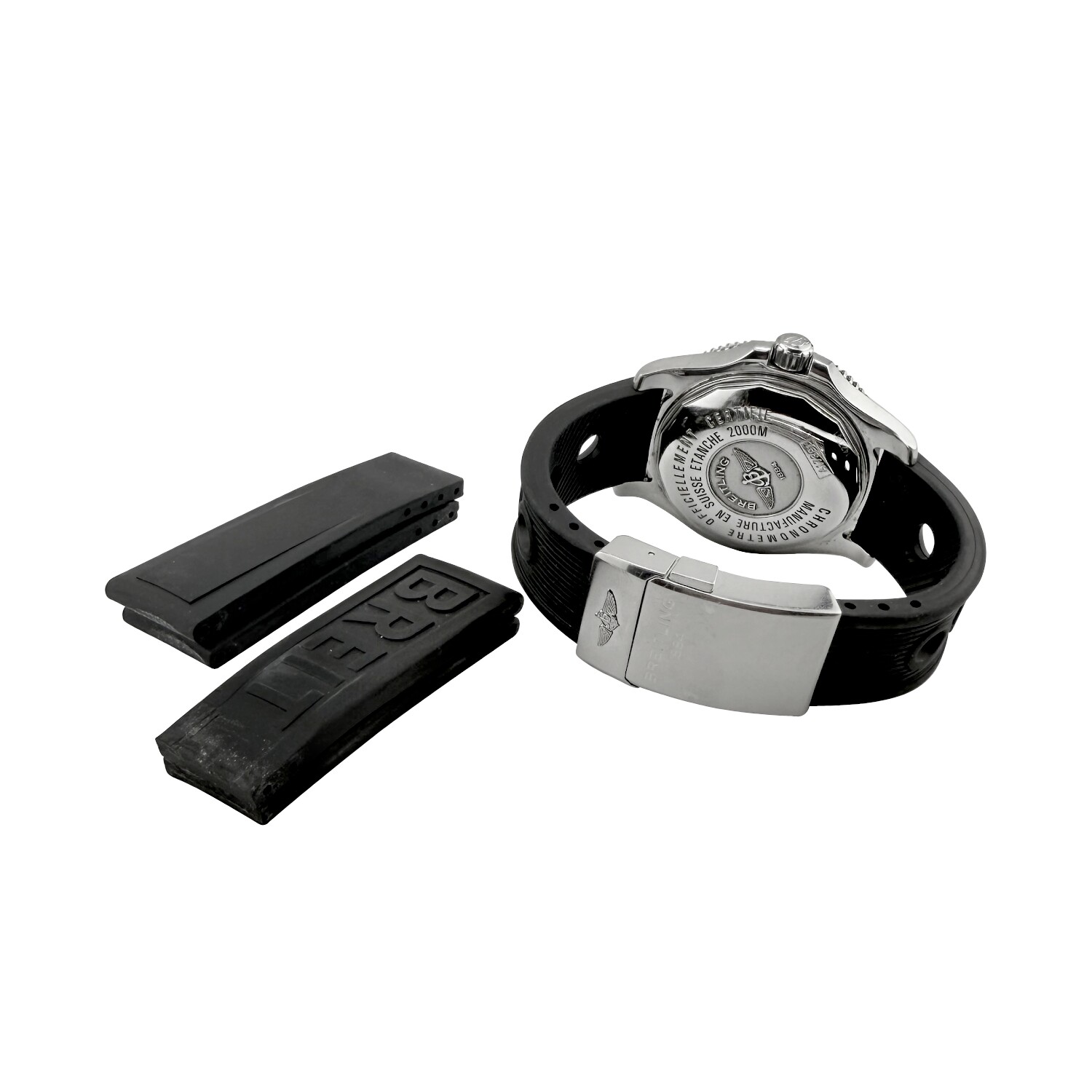 Possède un bracelet caoutchouc noir diver et boucle déployante en acier + 2 sets de bracelets en caoutchouc noir.