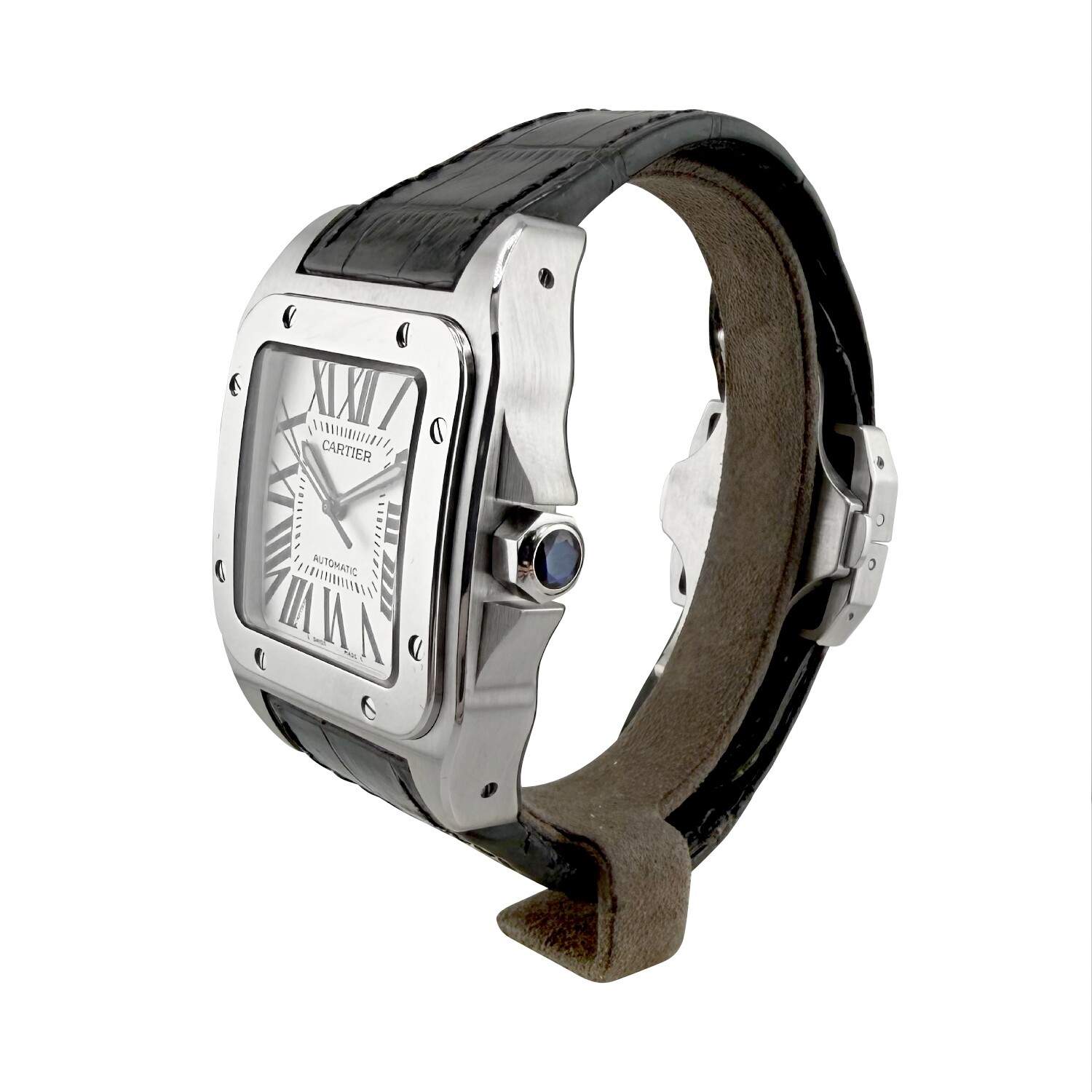 Cartier Santos 100 XL, REF 2656, boitier acier 38/51mm, cadran blanc avec chiffres romains. Dotée d'un mouvement automatique. Bracelet cuir noir avec boucle déployante en acier signée Cartier. No Date.