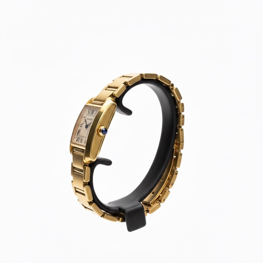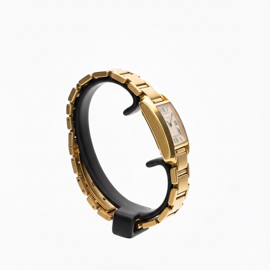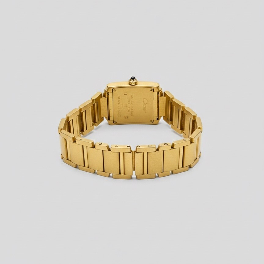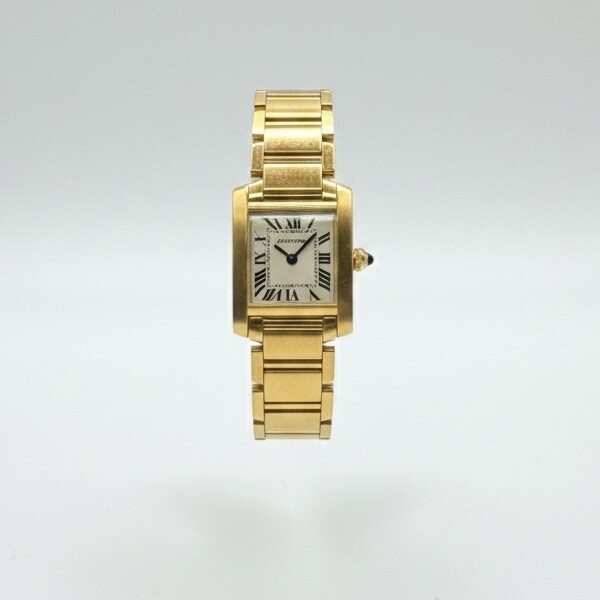 Cartier TANK Francaise , référence 2385, dotée d'un boitier en or jaune 18K 20mm x 25 mm, sur bracelet tout or jaune 18K avec boucle déployante. Mouvement à quartz. Cadran blanc chiffres romains.