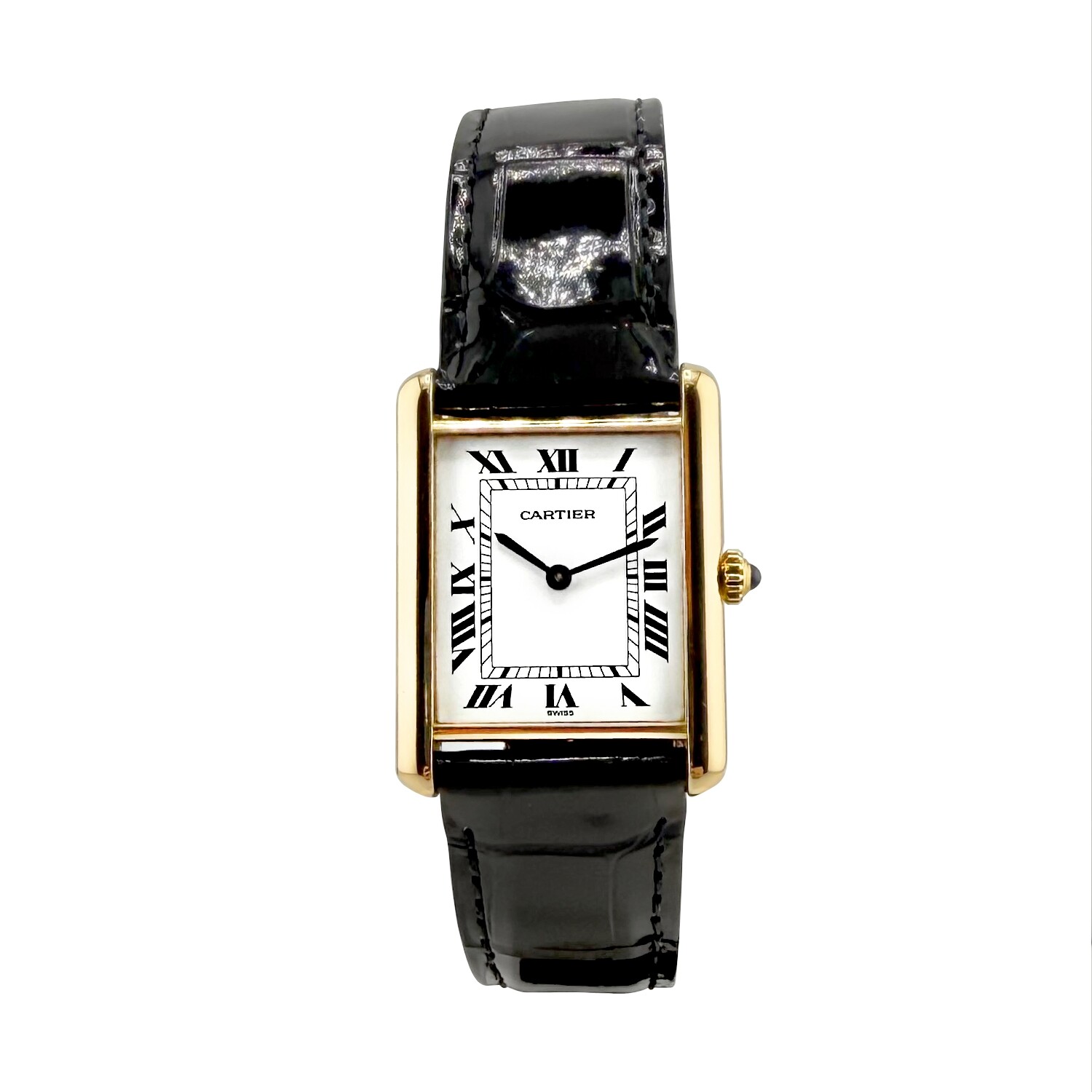 Cartier Tank dotée d'un boitier rectangulaire en or jaune 18K dimensions 23/31mm, référence 8105, cadran blanc, sur bracelet cuir alligator noir. Avec boucle déployante Cartier en Or jaune 18K.