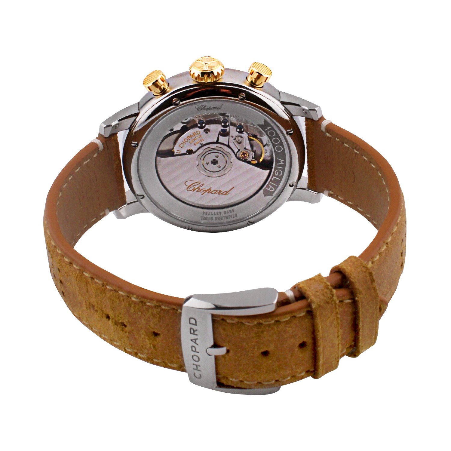 Montre Chopard Mille Miglia 168619-4001 chronographe dotée d'un mouvement automatique. Modèle Classic Racing en or jaune et acier, boitier 40.5mm, sur bracelet cuir veau marron perforé boucle ardillon acier, cadran gris bleu laqué finition satinée. Fond transparent.