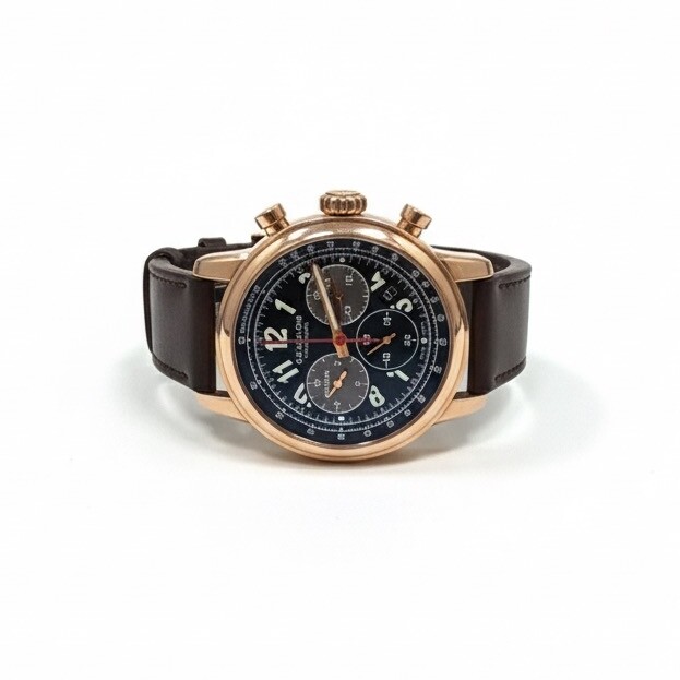 Boitier en 46mm en or rose 750, sur cuir veau marron et boucle déployante en or rose.