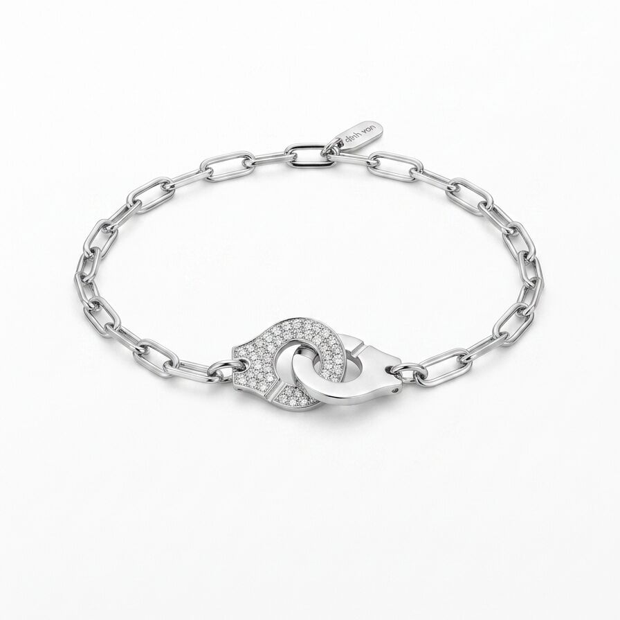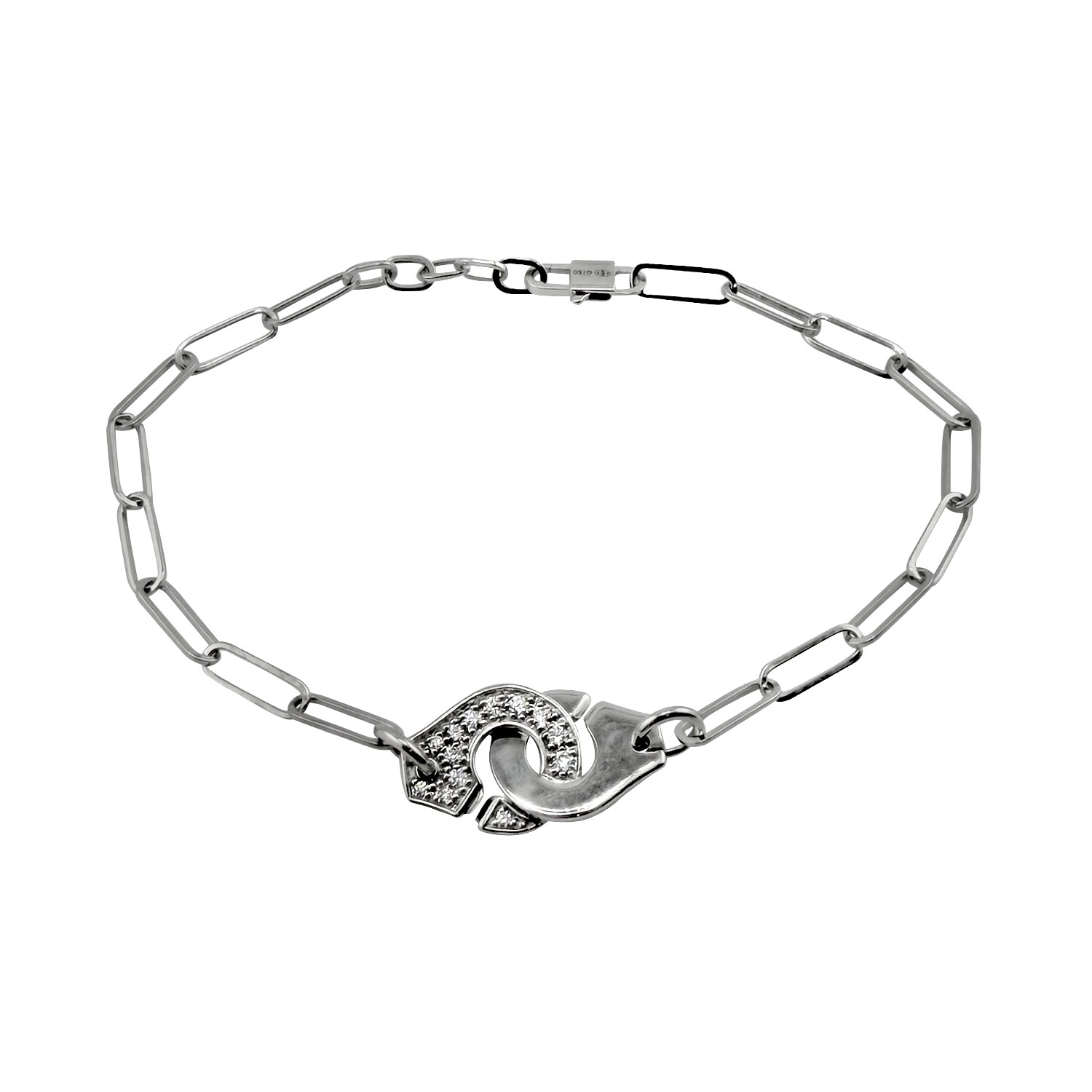 Bracelet iconique paré de scintillants diamants qui illumine la deuxième menotte en or blanc 750 millièmes.