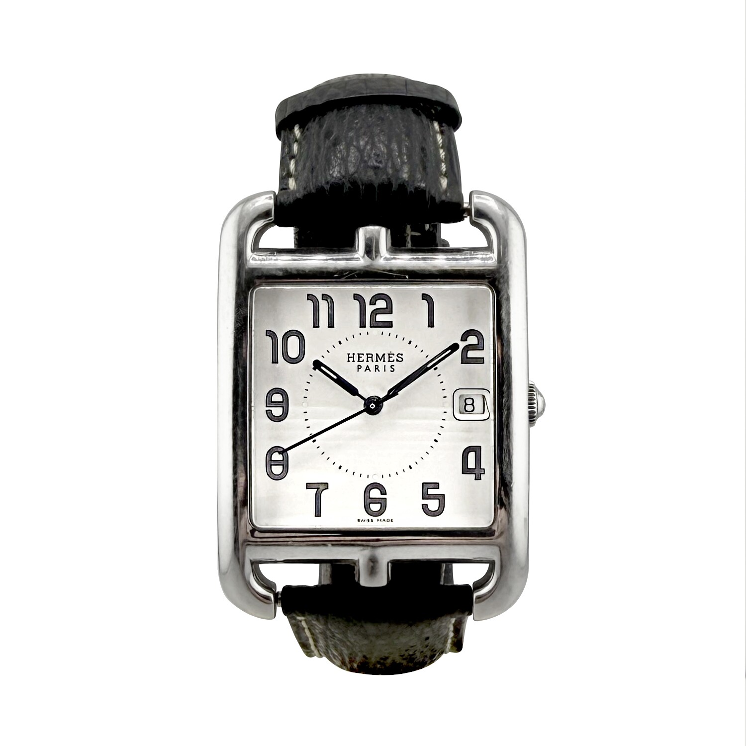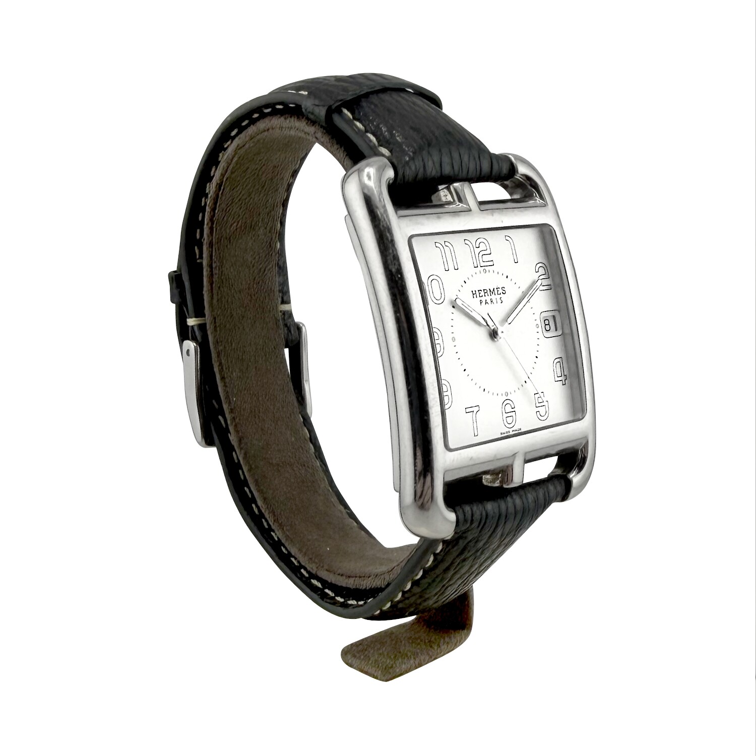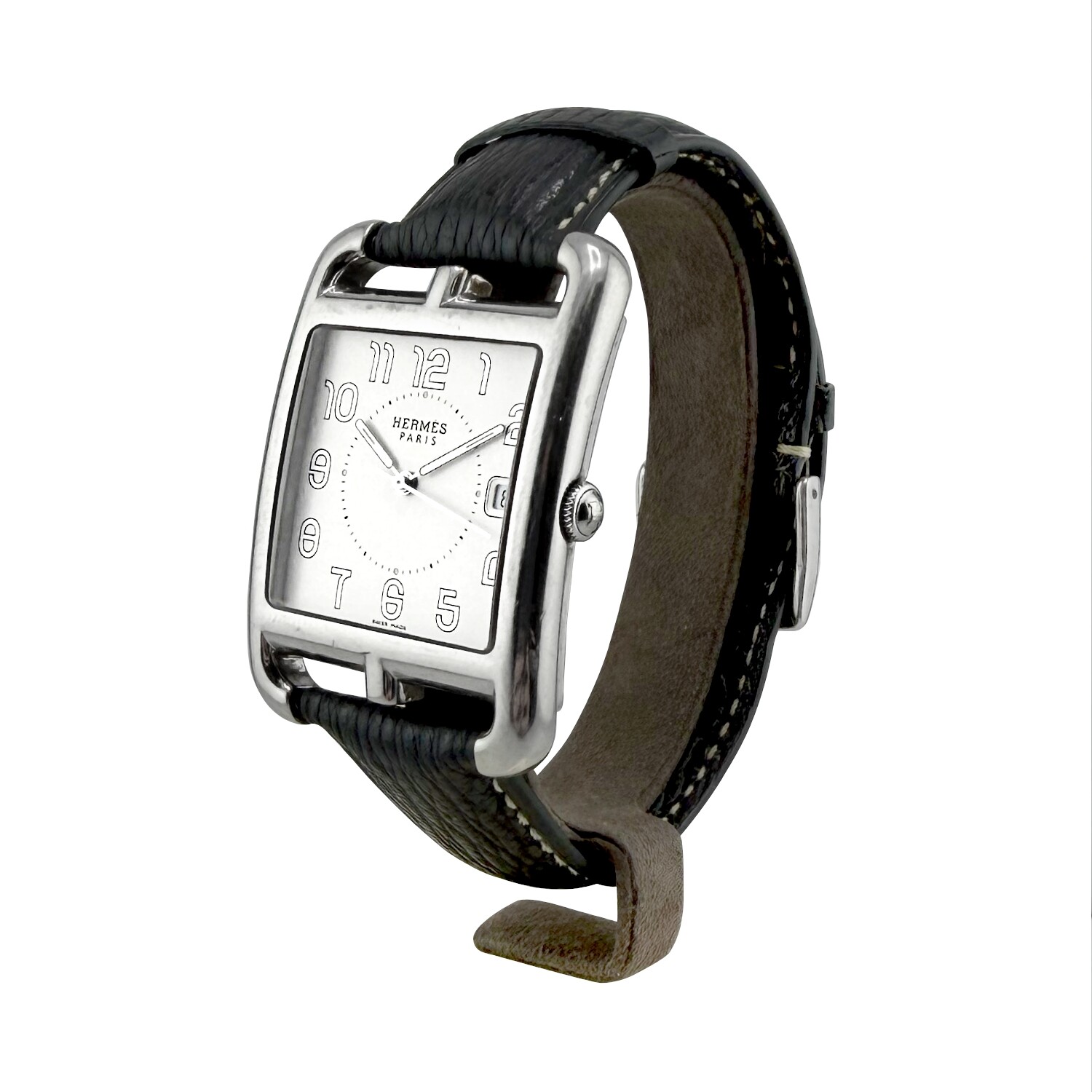 Hermès modèle, CAPE COD, Référence CC1.810, boitier acier, Grand Modèle 33/46mm, mouvement à quartz. Bracelet cuir, boucle ardillon acier. Affiche la date.