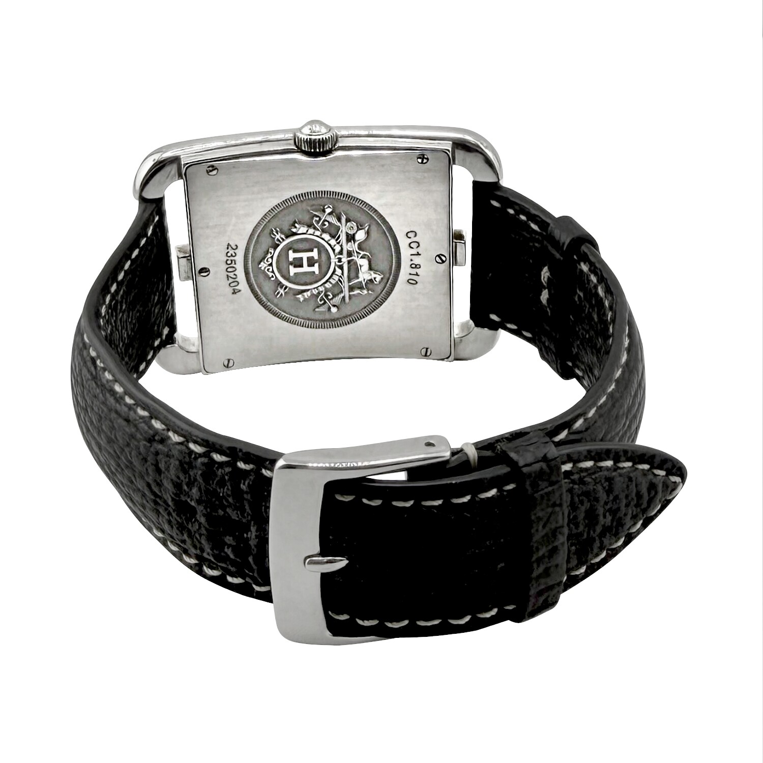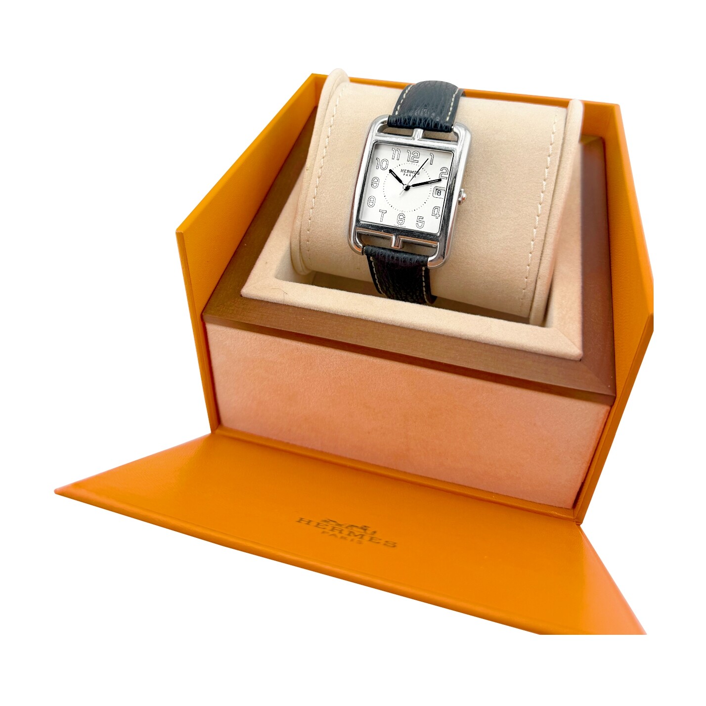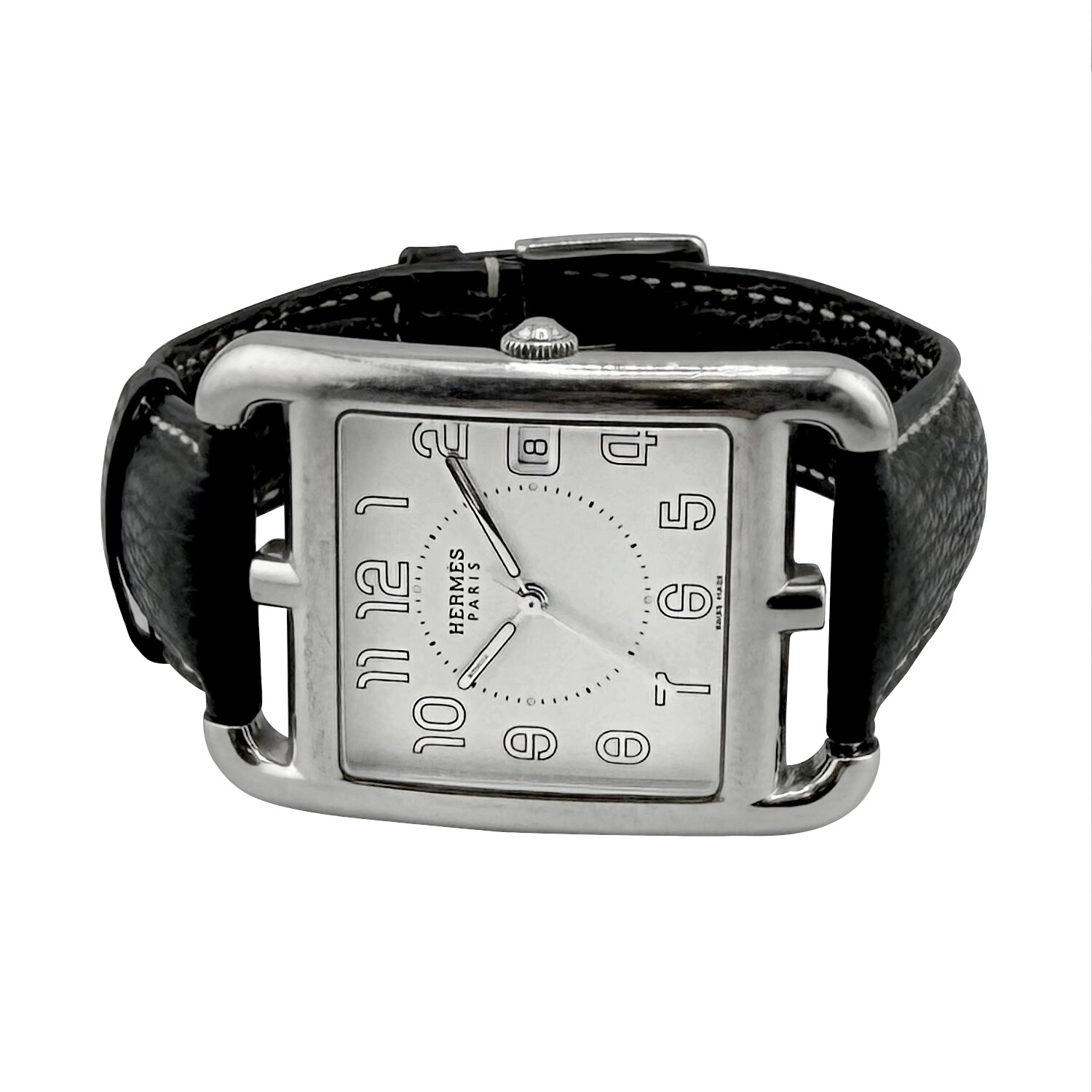 Hermès modèle, CAPE COD, Référence CC1.810, boitier acier, Grand Modèle 33/46mm, mouvement à quartz. Bracelet cuir, boucle ardillon acier. Affiche la date.