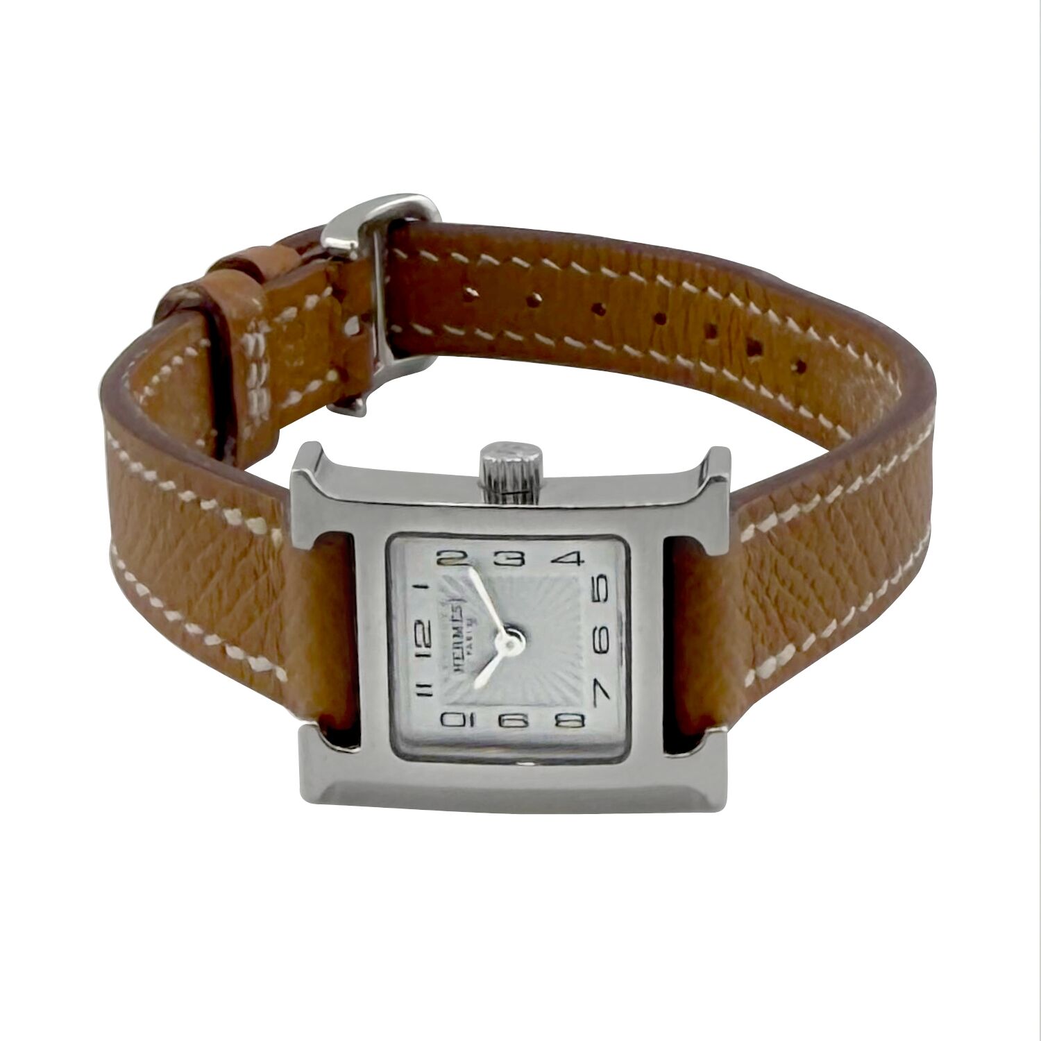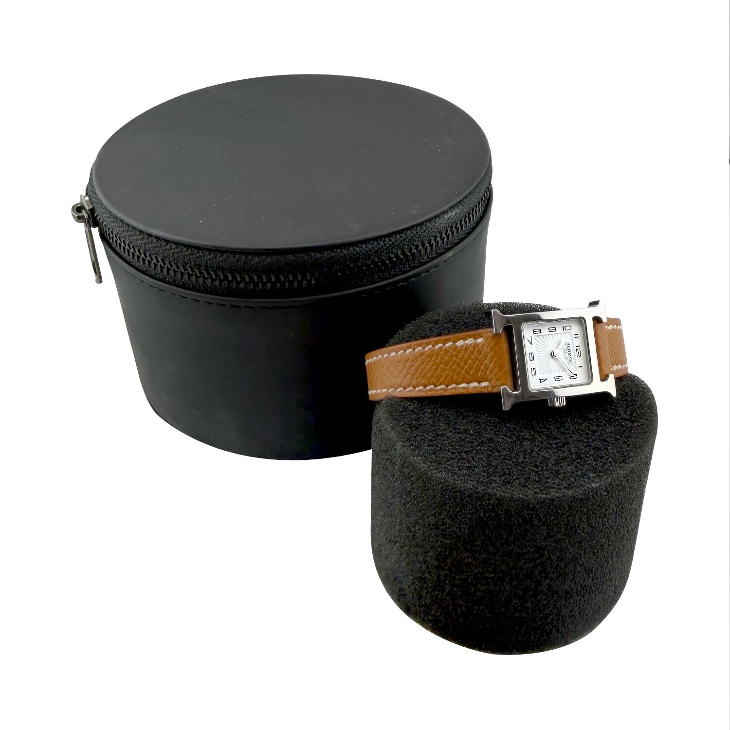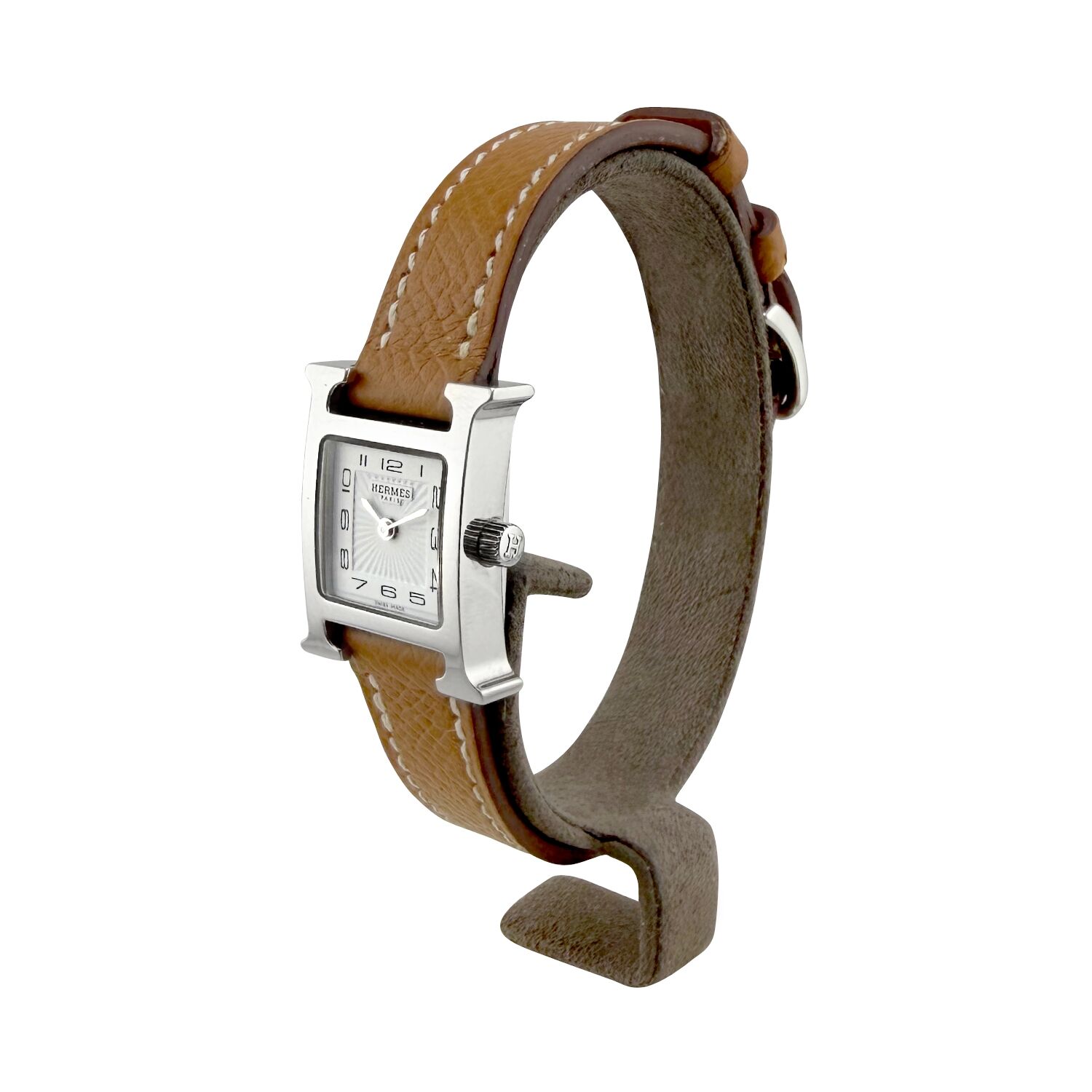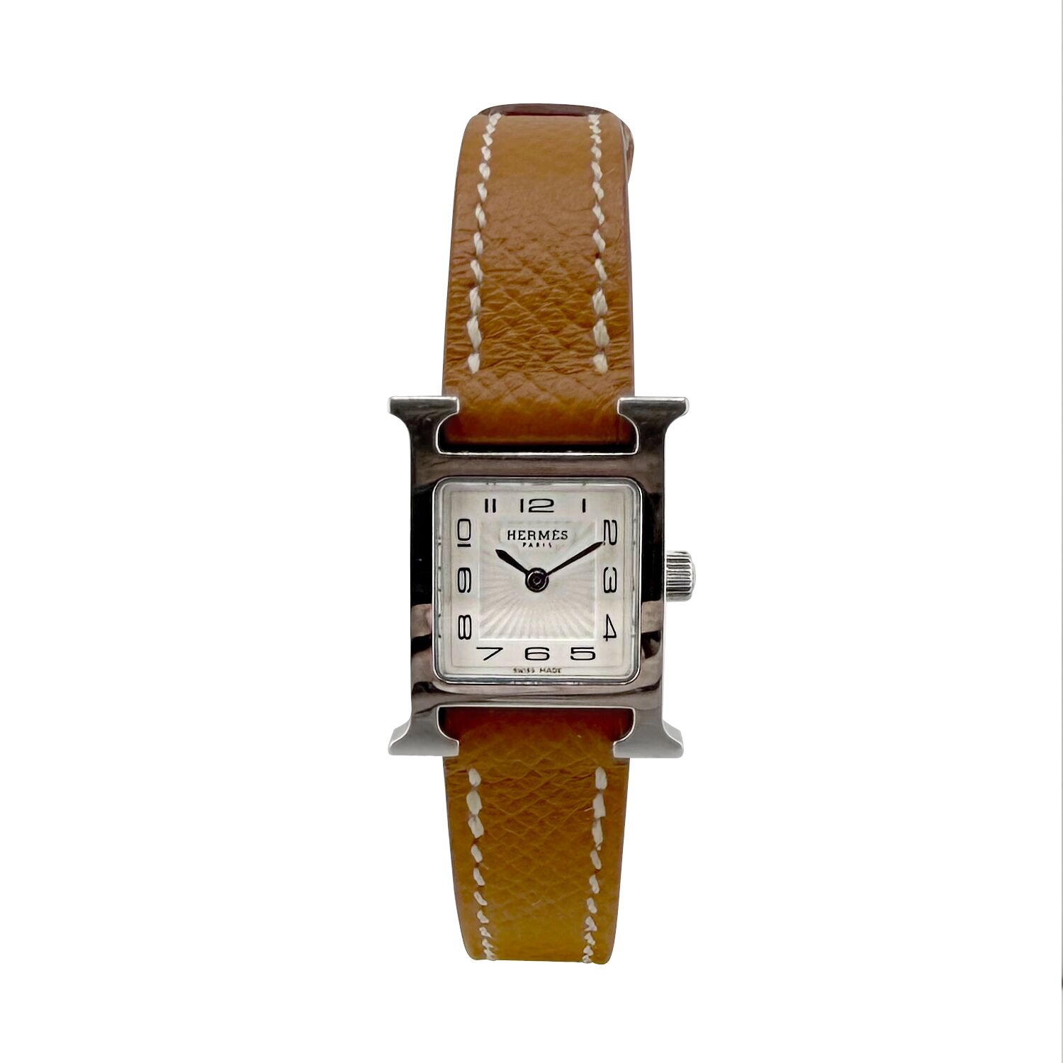 Montre Heure H Mini H1.110 en acier, cadran blanc, bracelet veau cuir lisse capucine et boucle ardillon acier. Mouvement à quartz.