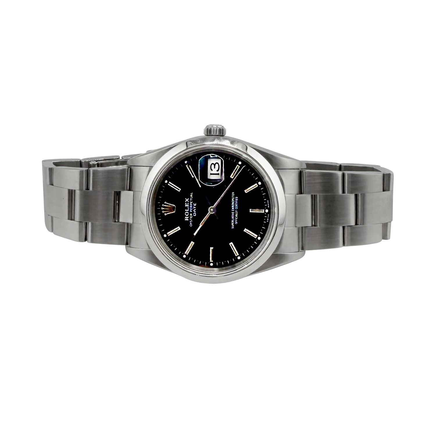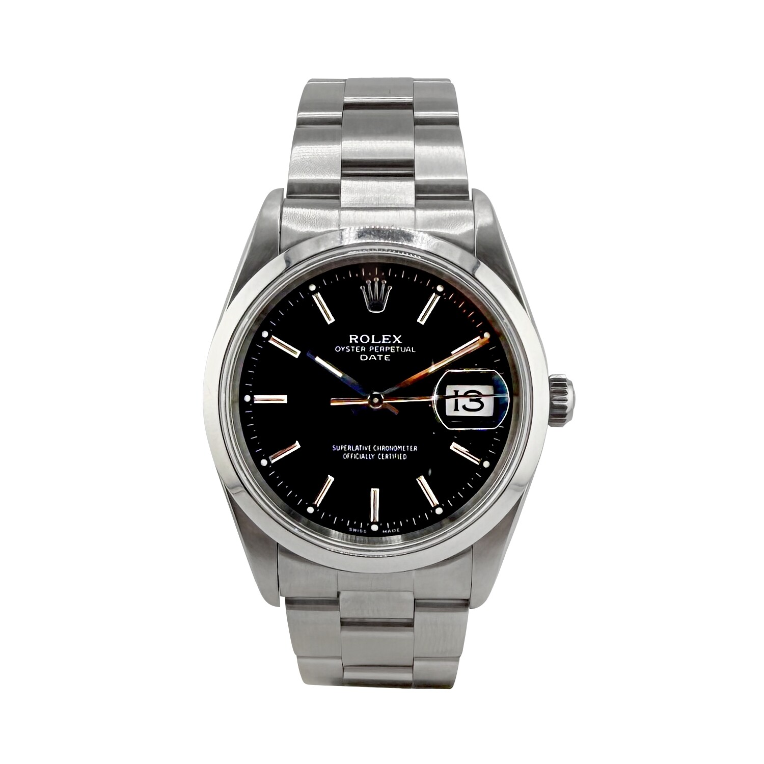 Rolex Oyster Perpetual Date, référence 15200, dotée d'un boitier en acier 34mm, lunette lisse et bracelet Oystersteel.