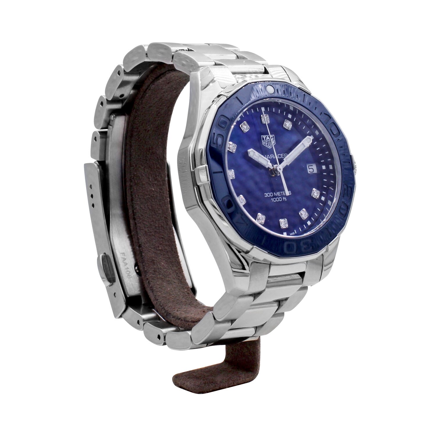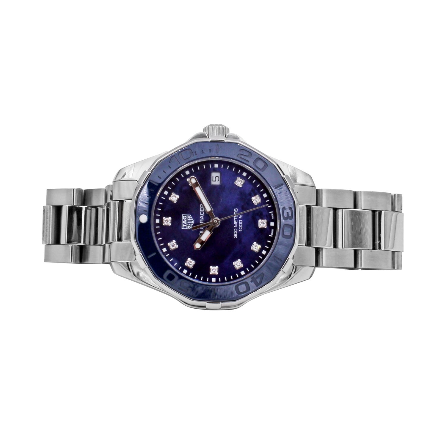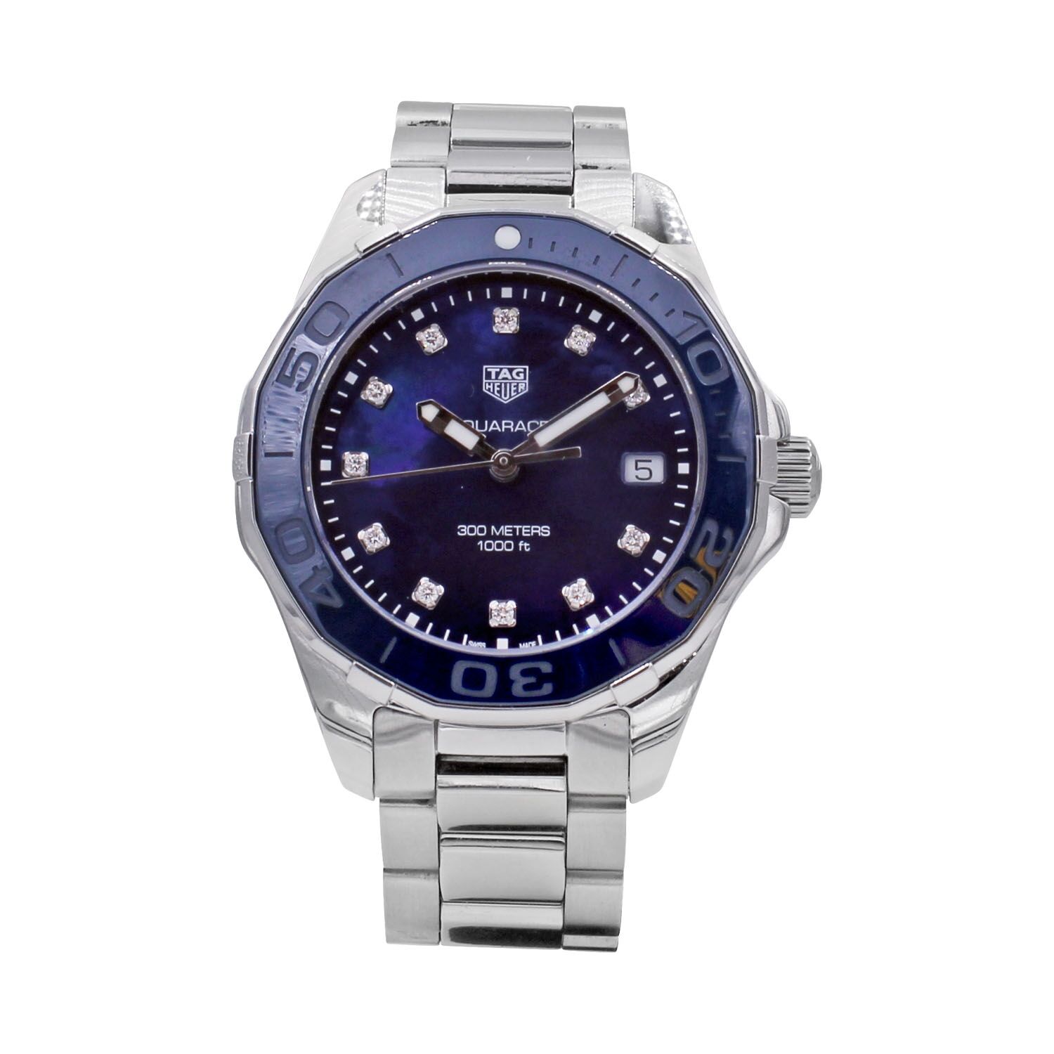 TAG HEUER Aquaracer lady dotée d'un boitier acier 35mm, d'un mouvement à quartz, avec un cadran nacre bleu orné d'index sertis diamants 0.1CT, et une lunette géométrique finition polie satinée bleue.
