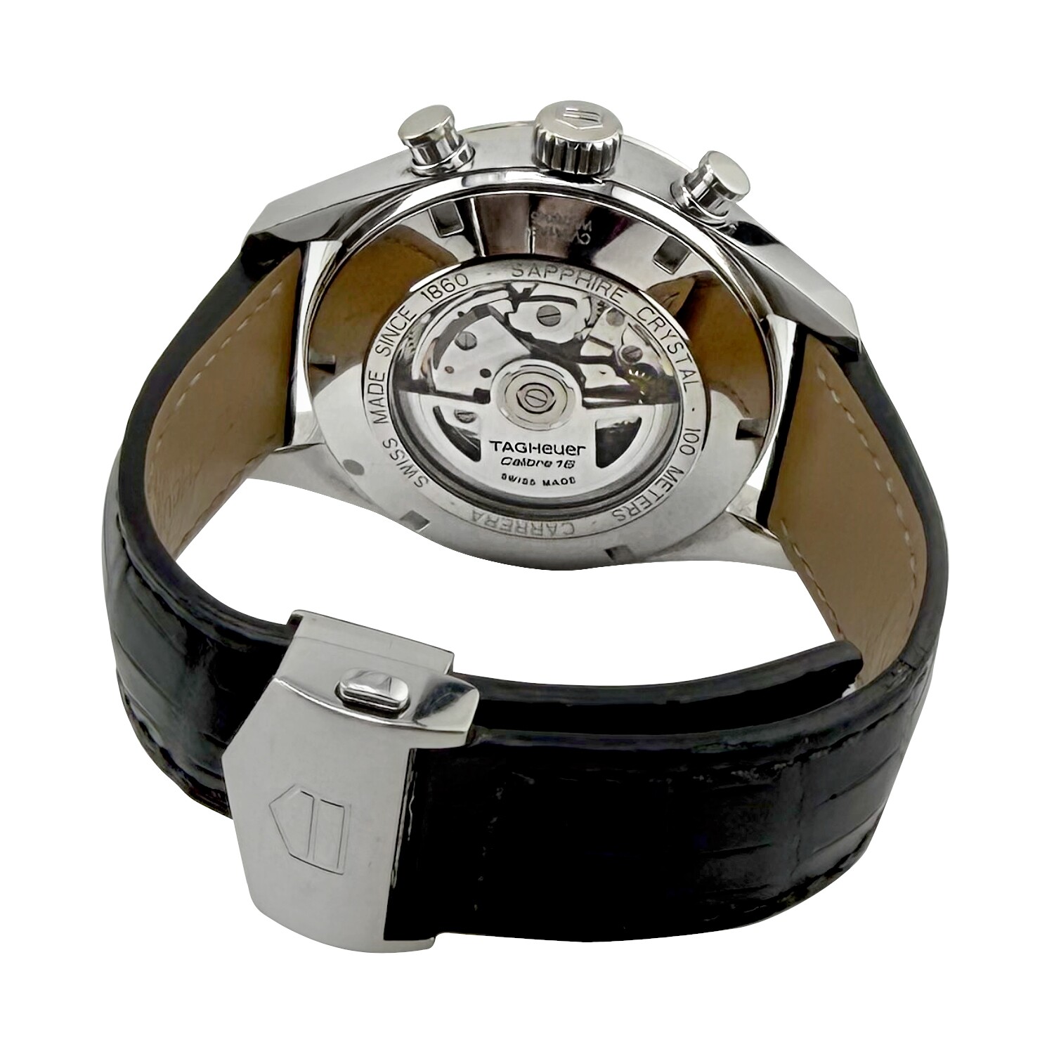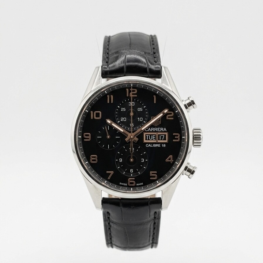 TAG Heuer Carrera Calibre 16, Chronographe, REF CV2A1AB, boitier acier 43 mm, cadran noir et détails en or rose. Affiche le Jour et Date. en anglais.