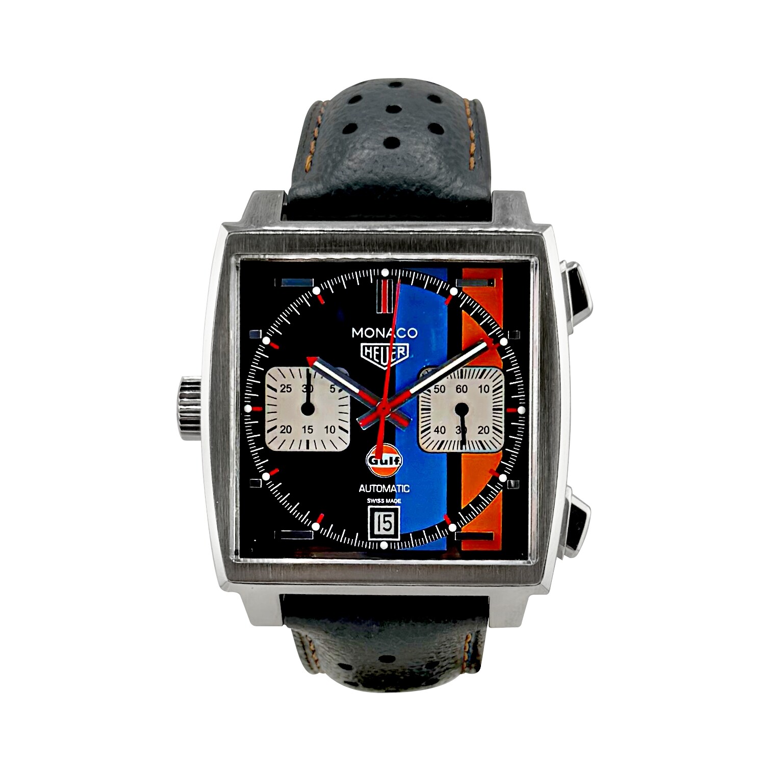 TAG Heuer Monaco GULF édition spéciale avec son boitier carré à sa forme singulière, en acier 39mm, mouvement automatique, cadran bleu marine/bleu clair et orange GULF, compteurs blancs à 3H et 9H.